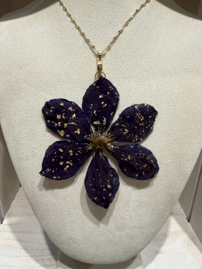 Je compose chaque bijou à la main, à partir de fleurs naturelles que je choisis, sèche, et assemble avec patience.
